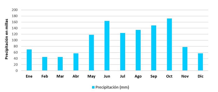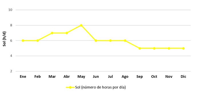 | Mes | Temperatura media mínima (°c) | Temperatura media máxima (°c) | Número de horas de luz / día (h) | Número de días de lluvia / mes (d) | Afluencia de turistas |