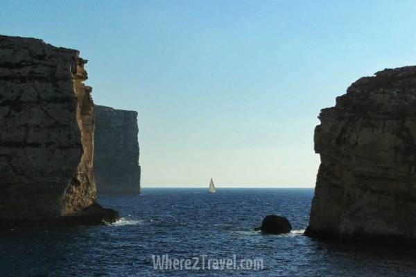 La bahía de Dwejra en Gozo es el hogar de varias formaciones rocosas naturales interesantes. Uno de ellos es la ventana de Azure, un enorme arco que lamentablemente se derrumbó en marzo de 2017 debido a la erosión. Otra hermosa curiosidad de la naturaleza cercana, es el Agujero Azul con sus aguas azules profundas que forman una piscina natural. También es un lugar ideal para bucear. Por último, toda la costa alrededor es muy hermosa, especialmente al atardecer.