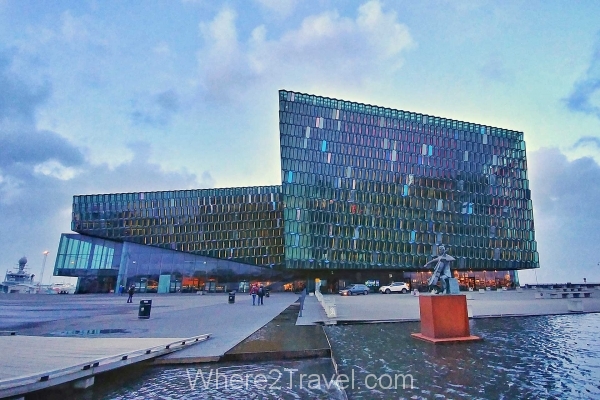 Harpa is a modern concert hall and a conference centre with a distinctive beautiful colored glass facade.